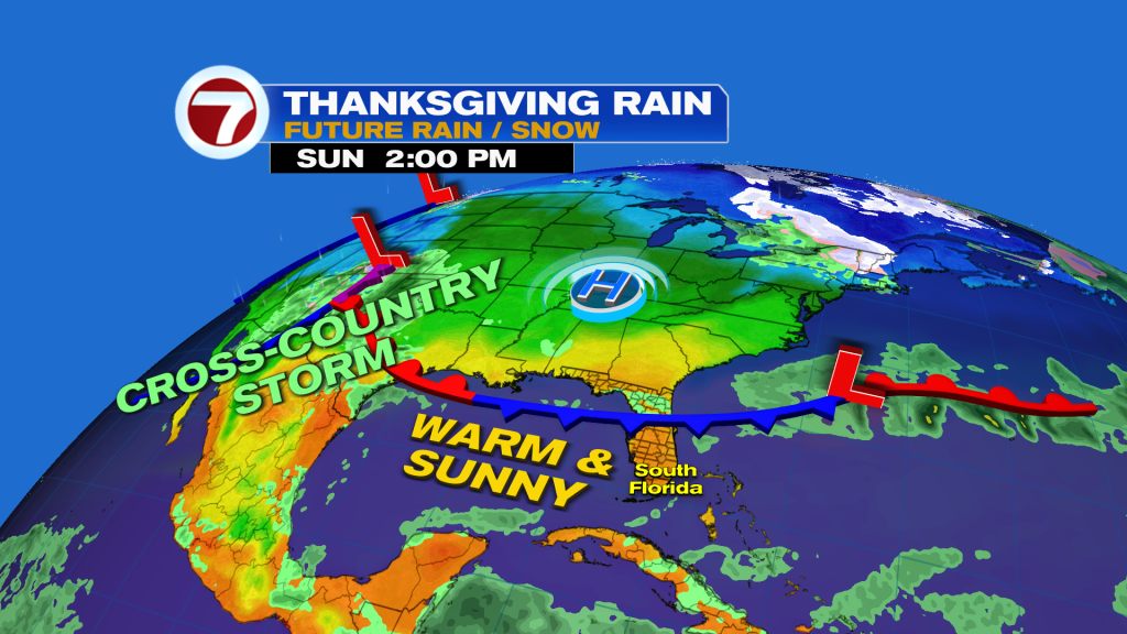 Going forward, our weather changes will be driven by a cold front. There will be a first one that gets very close to South Florida on Monday but it won’t reach us. It’s not until Thanksgiving into Black Friday when a stronger front makes it through — the one currently over the Southwest US — leading to the seemingly rare potential for rain.