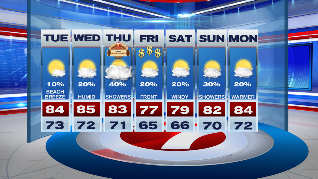 As we continue through the holiday week, there will be slight changes to the forecast. While the forecast does promise to bring a few more days of calm and quiet weather for South Florida, we will begin to notice a few changes day to day. Humidity levels will gradually climb ahead of our next front (which unfortunately will not clear us in time for Thanksgiving). Warm and humid conditions return by Wednesday with the possibility of a few spotty showers. And with the front entering South Florida, isolated to scattered showers will be possible on Thanksgiving. It won’t be a complete washout but with the holiday upon us, be sure to plan accordingly. If the front clears the entire region, then it looks like we will see drier conditions for any Black Friday shopping plans you may have. It will turn quite windy and those strong winds stick around for the start of the upcoming weekend.