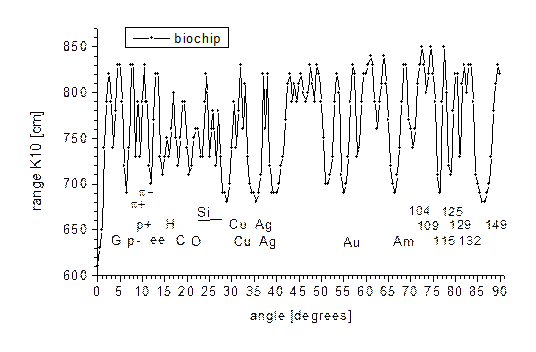 Fig. 4. Spectrum from a silicon wafer of the biochip from Fig. 1.3. Designations: G - gravitons, p- - antiprotons, π+ - positively charged pions, π- - negatively charged pions, p+ - protons, ee - Cooper electron pair, H - hydrogen, C - carbon, Si - three isotopes of silicon, Cu - two isotopes of copper, Ag - two isotopes of silver, Au - gold, Am - americium, subsequent numbers indicate elements with atomic numbers 104 - 149 (except for element 115, the determination of the atomic number may be with an error of +/- 1). The abscissa axis - the angle of the beam deflected relative to the normal for the undeflected beam measured in degrees. The ordinate axis - the range of radiation of Category K10 from samples at the spectroscope output measured in centimeters.