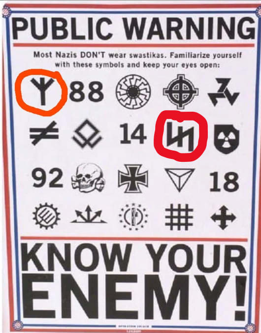 See the Algiz rune circled in red. Other symbols also bear resemblance, you can see the horns of Lucifer in one of the Transhumanist logos as well - can you see it?