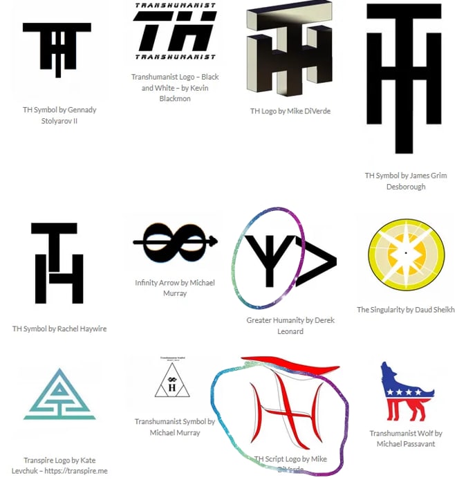 Note the Greater Humanity Transhumanist symbol is the Nazi occult Algiz Rune. Of Course the triads are Masonic Illuminati Symbols.