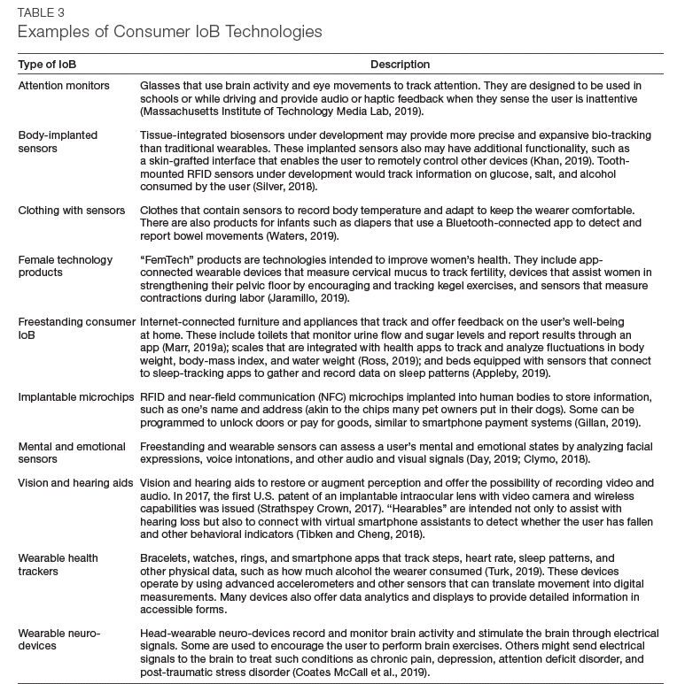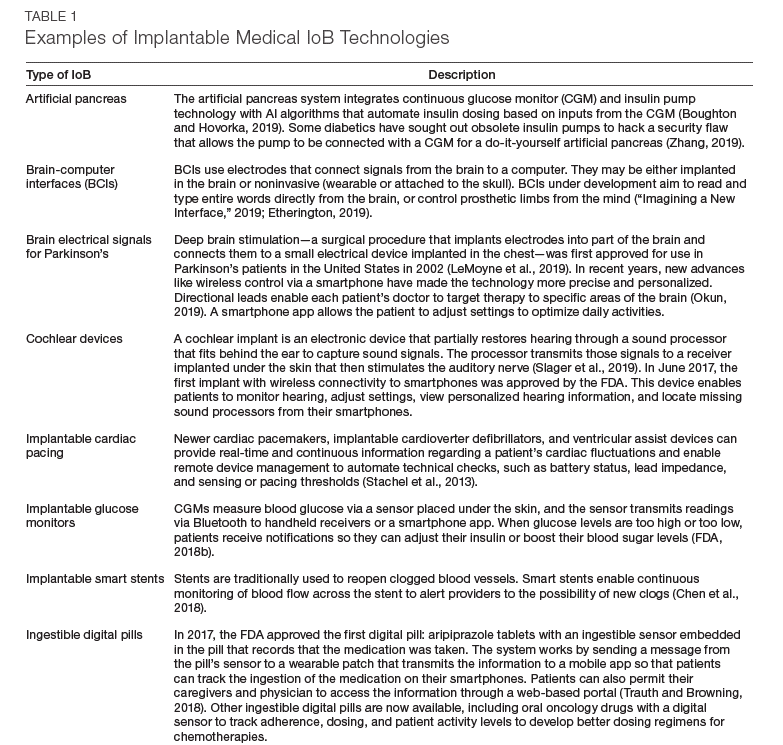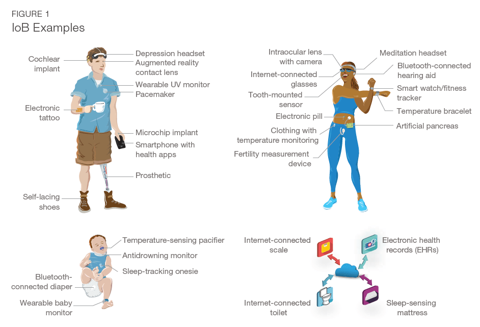 IoB devices generally, but not always, require a physical connection to the body (e.g., they are worn, ingested, implanted, or otherwise attached to or embedded in the body, temporarily or permanently). Many IoB devices are medical devices regulated by the U.S. Food and Drug Administration (FDA).3 Figure 1 depicts examples of technologies in the IoB ecosystem that are either already available on the U.S. market or are under development.